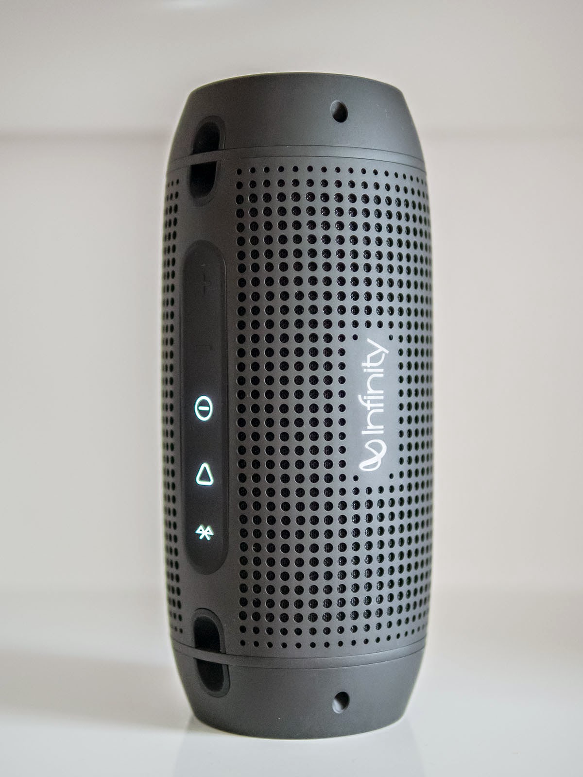 Также нет ручки для переноса, поэтому вы должны быть действительно осторожны, так как он довольно объемный для надежного захвата. Но есть что-то вроде наконечников в верхней части динамика с обеих сторон, благодаря которым его можно прикрепить к цепи - пусть висит на шее, как большая толстая гангста-цепь! Мой друг уже использовал эти выступы, для того, чтобы закрепить Infinity One ремнем к рюкзаку во время езды на велосипеде.